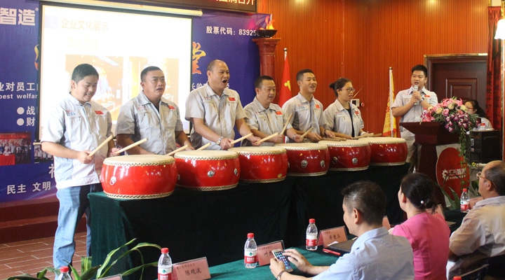 會(huì)議開(kāi)始,全體員工整肅衣冠端身正意滿懷赤誠(chéng)之心向企業(yè)“孝道、商道、人道”行三鞠躬禮,宣讀企業(yè)愿景——成為全球領(lǐng)先的整廠自動(dòng)化系統(tǒng)解決方案提供商,企業(yè)使命——做受尊敬的好人、造受尊敬的產(chǎn)品、辦受尊敬的企業(yè)、建受尊敬的平臺(tái),企業(yè)精神——用情做人、用心做事,團(tuán)隊(duì)精神——忠誠(chéng)團(tuán)結(jié)、勤奮進(jìn)取。隨后,匯興智造高管:鐘世鑫、胡偉路、呂常垣、黃艷、廖飛、張強(qiáng),共同敲響士氣鼓、鼓舞匯興智造奮勇前進(jìn)。