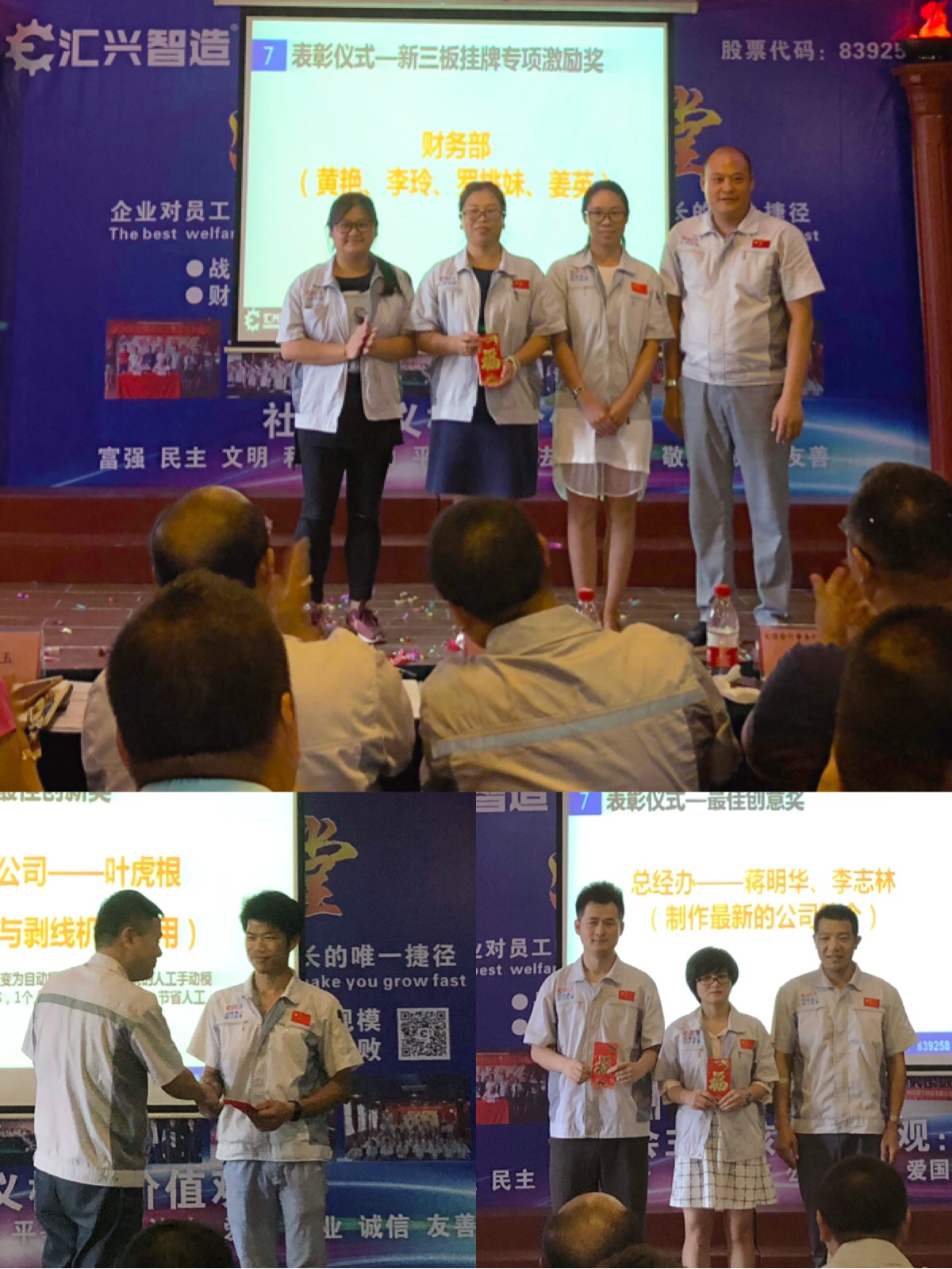隨后舉行新員工入職歡迎儀式,每個(gè)月份都會(huì)有各個(gè)領(lǐng)域的人才加入?yún)R興智造這個(gè)大家庭,企業(yè)的快速發(fā)展需要更多的人才輸入,堅(jiān)信在匯興智造,定能營(yíng)造愈加廣闊的舞臺(tái),各位新老員工在這里都能遇見(jiàn)最美麗的自己。同時(shí)對(duì)公司有重大貢獻(xiàn)的各位同事進(jìn)行頒獎(jiǎng)儀式,包括新三板掛牌專項(xiàng)激勵(lì)獎(jiǎng)、最佳創(chuàng)新獎(jiǎng)、好點(diǎn)子獎(jiǎng)、新聞撰寫?yīng)?、人才推薦獎(jiǎng)、最佳創(chuàng)意獎(jiǎng)。