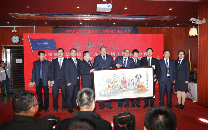 晚會(huì)現(xiàn)場(chǎng),匯興智造董事會(huì)、監(jiān)事會(huì)成員登臺(tái)舉行宣誓儀式,為2018沖鋒表決心、擂戰(zhàn)鼓,確保公司在2020年前實(shí)現(xiàn)效率倍增、業(yè)績(jī)倍增、效益倍增,成功登陸創(chuàng)業(yè)板。儀式結(jié)束后,宣誓成員們圍繞在梁培浩教授贈(zèng)送的畫作《大吉大利》周圍,借用畫上8只憨態(tài)可掬的小狗送出“旺狗賀歲、歡樂(lè)祥瑞”的祝福。8,既代表2018,也代表“發(fā)”,祝福匯興智造在2018大發(fā)展,創(chuàng)新高。