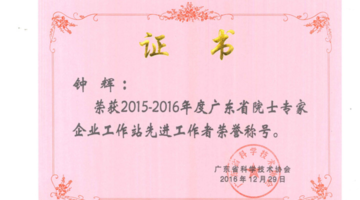 匯興智造董事長(zhǎng)鐘輝榮獲2015-2016年度廣東省院士專家企業(yè)工作站先進(jìn)工作者。